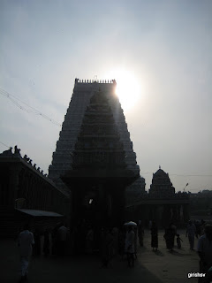 Tiruvannamalai the home of Annamalayaar or Arunachaleswarar (Shiva worshipped as a Shiva Lingam) and Unnamulaiyaal (Apitakuchambaal – Parvati), is one of the largest temples in India. It occupies a special place in the Saivite realm and is regarded as one of the Pancha Bhoota Stalams (one of the five grand temples associated with the five basic elements) – associated with the element Fire, the other four being Tiruvanaikkaval (Water), Chidambaram (Space), Kanchipuram (Earth) and Sri Kalahasti (Wind) respectively. Shiva is said to have manifested himself in the form of a massive column of fire, whose crown and feet, Bhramma and Vishnu attempted in vain to reach. A celebration of this manifestation is seen today in the age old traditions observed in the Shivaratri and the Kartikai Deepam Utsavams held here.