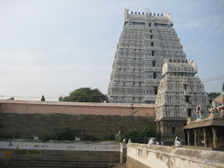 In the meanwhile, preparations go on for the afternoon’s climax. Four of the five decorated Pancha Murthys are are brought out from the main shrine of the temple and housed in Vimanams in the 3rd prakaram of the temple, facing the flag staff and the Annamalai Hill. The last to arrive is Annamalaiyar who comes out of the second prakaram, dancing with his consort.