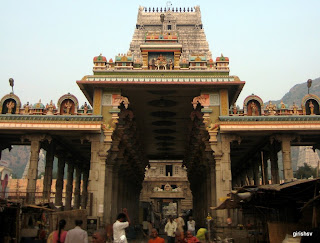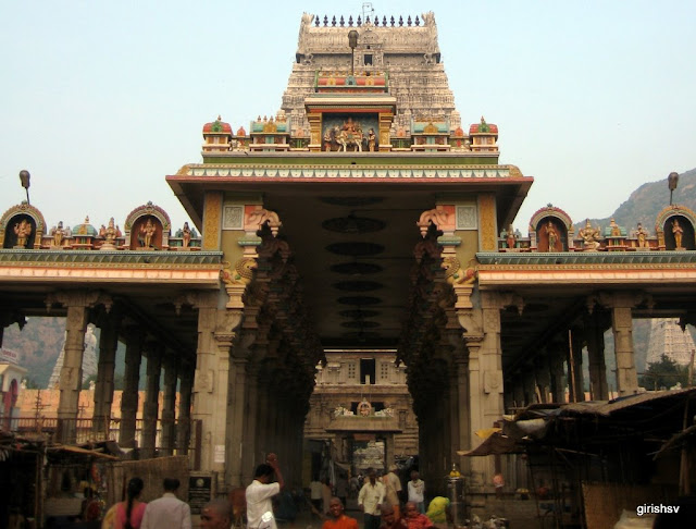 Architecture: The ancient and vast Arunachaleswarar Temple as it stands today is the result of several centuries of building, alteration and extension. A Nandi faces the main shrine in each of its five prakarams. The outermost prakaram houses the thousand pillared hall and the Shiva Ganga tank and is pierced on four sides with colossal Gopurams. . The fourth prakaram includes the Bhramma Tirtham, and its eastern gateway Vallala Gopuram holds a statue of King Ballala. The third prakaram which dates back to the 12th century AD has several Linga Shrines, and the Kili Gopura Entrance. In the East side of the prakaram stands the Flag Staff while the Northern side is home to the massive shrine of Unnamulai Amman. The 3rd prakaram surrounds the roofed 2nd prakaram which houses the pantheon of deities associated with Shiva, which in turn surrounds the shrine of Annamalaiyar.